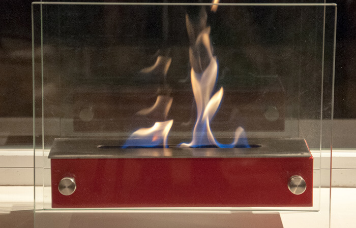Modelo conformado por un quemador de acero inoxidable suspendido por medio de dos vidrios laterales que hacen de apoyo. Se puede usar como centro de mesa tanto en interiores como exteriores. Los vidrios no toman temperatura en la zona de contacto con la mesa, por lo que se puede apoyar sobre materiales delicados sin ningún tipo de riesgo. Con tapa de encendido y apagado. Espacio mínimo requerido: 25 m3
