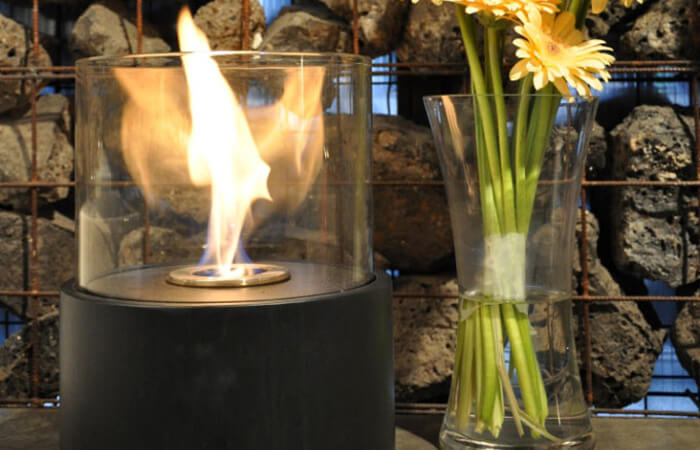 Fanal con fuego de gran impacto visual debido a su particular vidrio cilíndrico. Brinda luz y calor mientras decora y convierte en mágico cualquier ambiente en el exterior. Puede colocarse sobre una mesa, en el piso o en las esquinas de una pileta ya que no se apaga con el viento. Espacio mínimo requerido: 25 m3