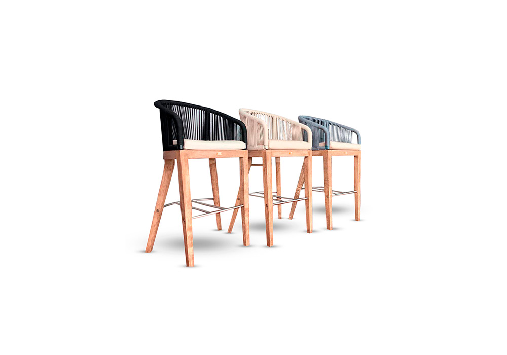 Ideal para galerías o superficies semicubiertas. Confeccionada con una base de madera maciza terminación envejecida, respaldo de aluminio anodizado tejido con hilo náutico y almohadón de asiento.