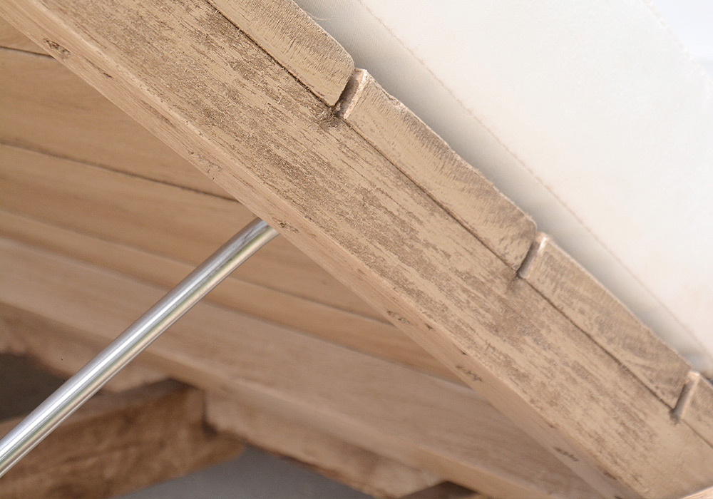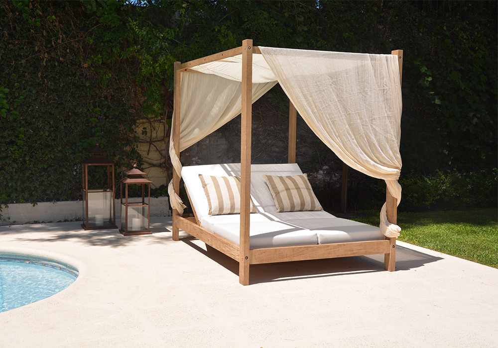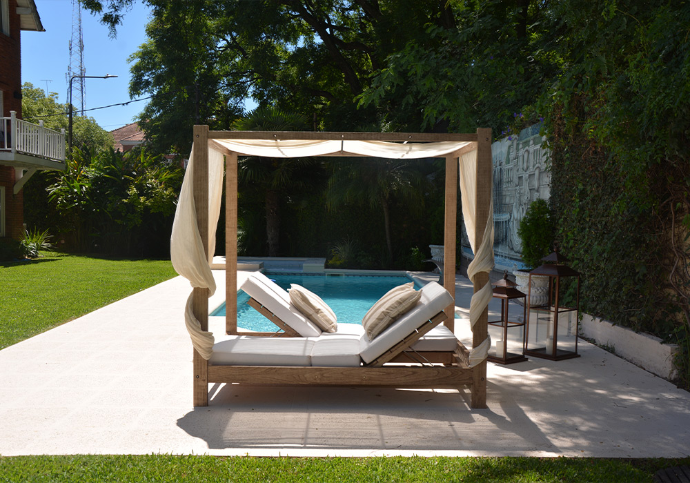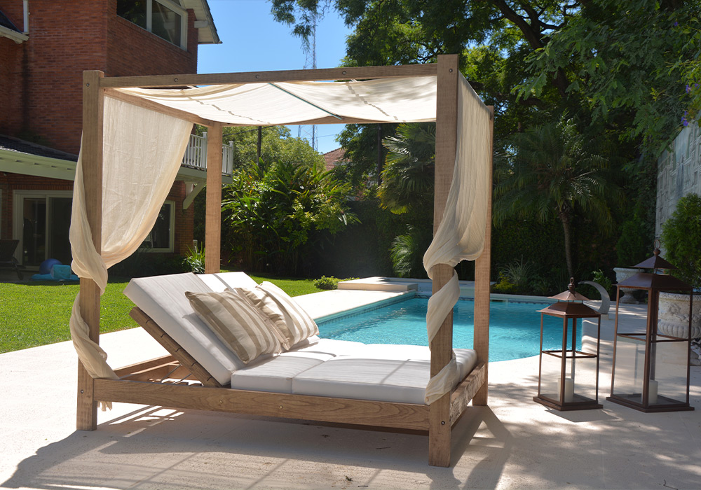 Fabricado en madera maciza terminación envejecida e incluye colchoneta confeccionada en tela género outdoor y gasa para el dosel. Dispone de 4 respaldos rebatibles para poder utilizarlo en cualquier posición.