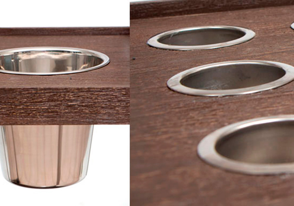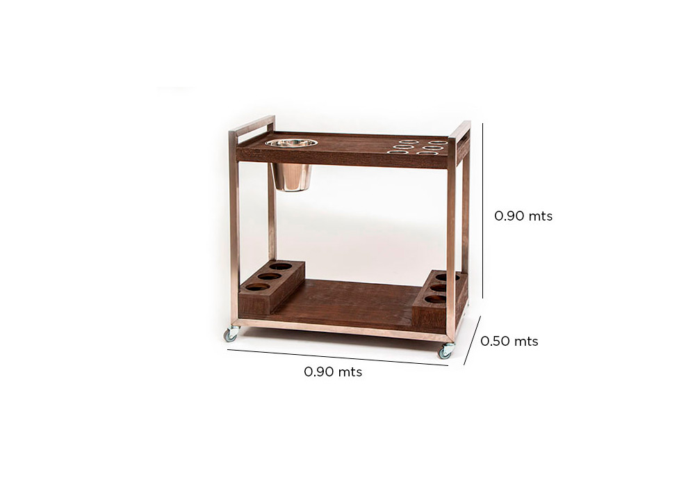 Fabricado en acero inoxidable y madera maciza con terminación envejecida. Cuenta con espacio para organizar las bebidas y en el sector superior cuenta con una frapera embutida de acero inoxidable para mantenerlas frías.
