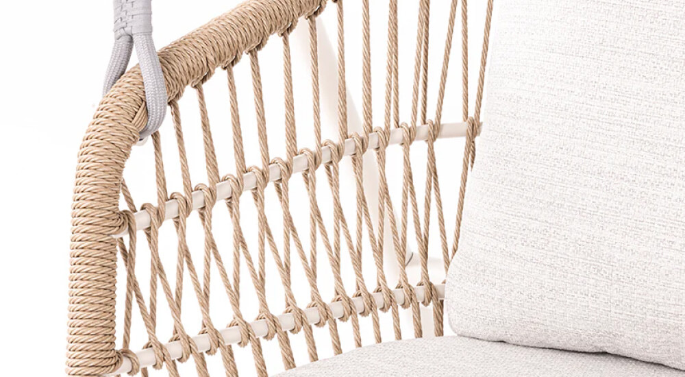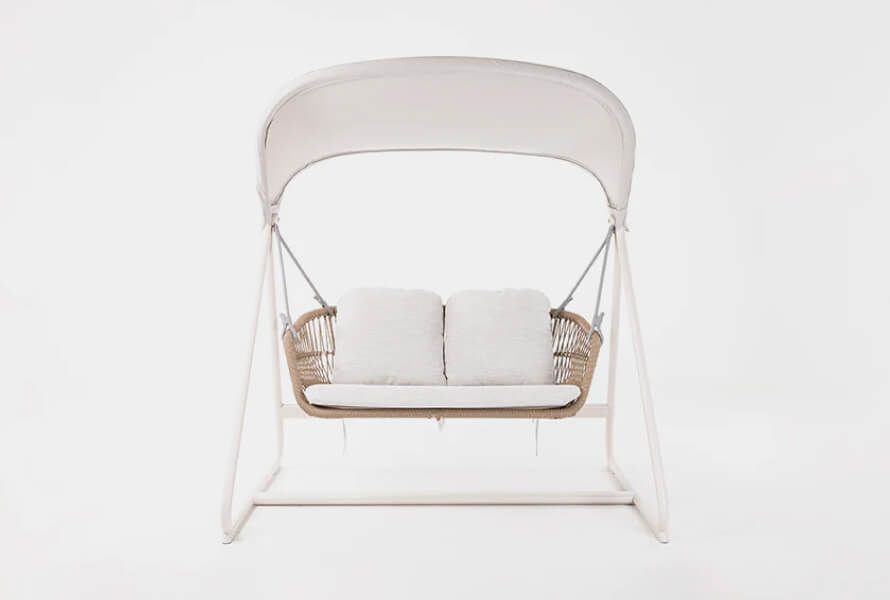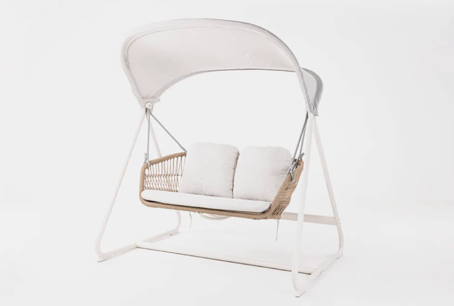 Es ideal para jardín, galería o terraza. Estructura de aluminio reforzada con terminación pintada a horno, asiento doble con tejido en hilo náutico importado de alta resistencia, acompañado de tapicería confeccionada en telas Outdoor, con protección anti micótico y a los rayos solares. Incluye capota para brindar protección solar y sombra durante el día.