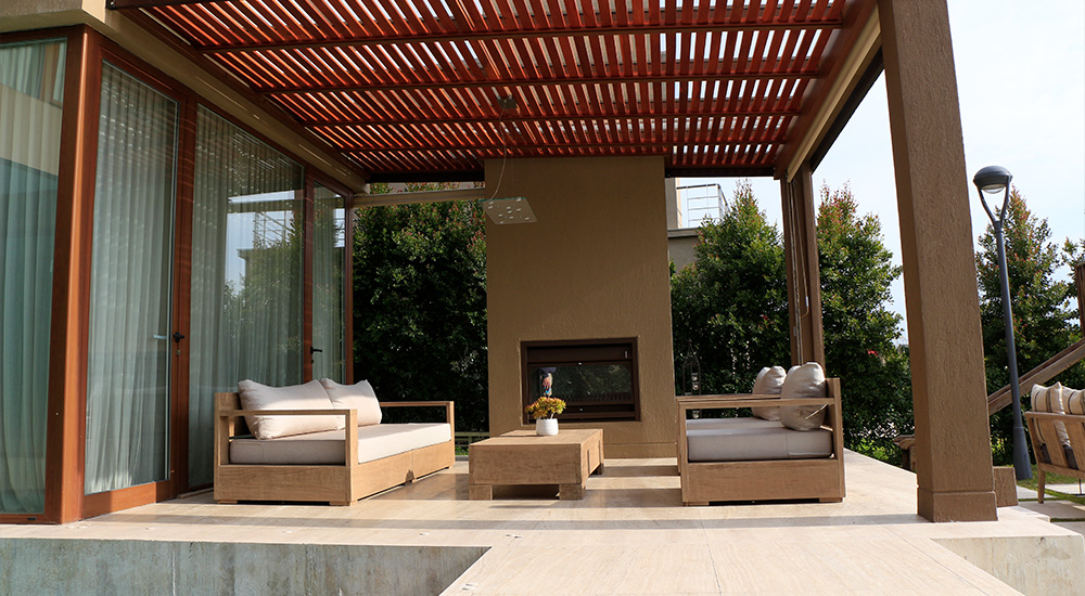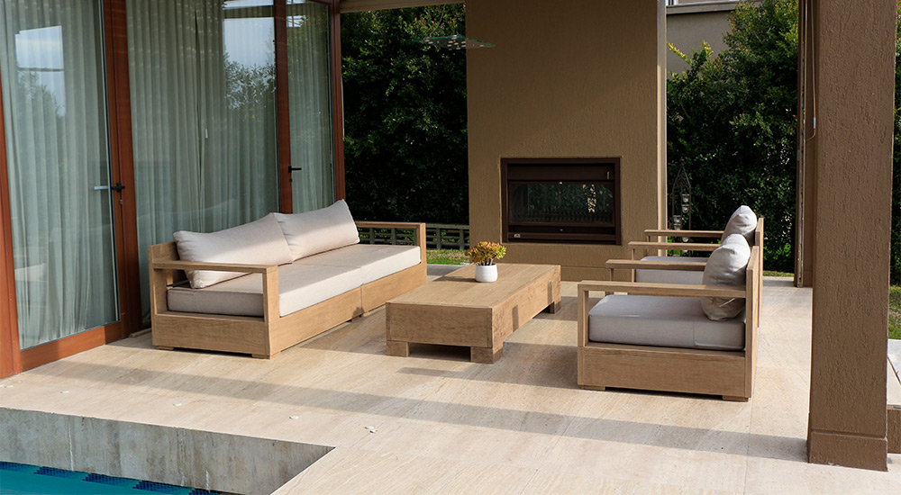 Madera maciza con terminación envejecida y tapicería Outdoor resistente a UV y antimicótico. Mesa con quemador de acero inoxidable opcional.
