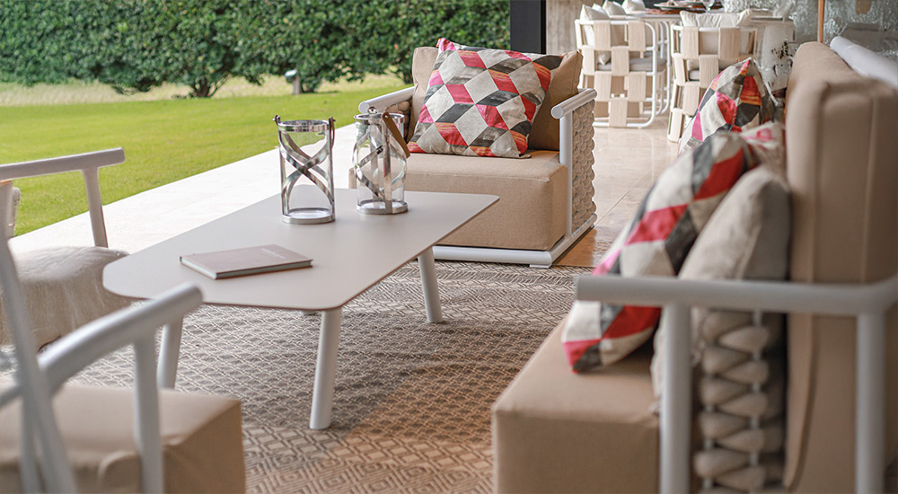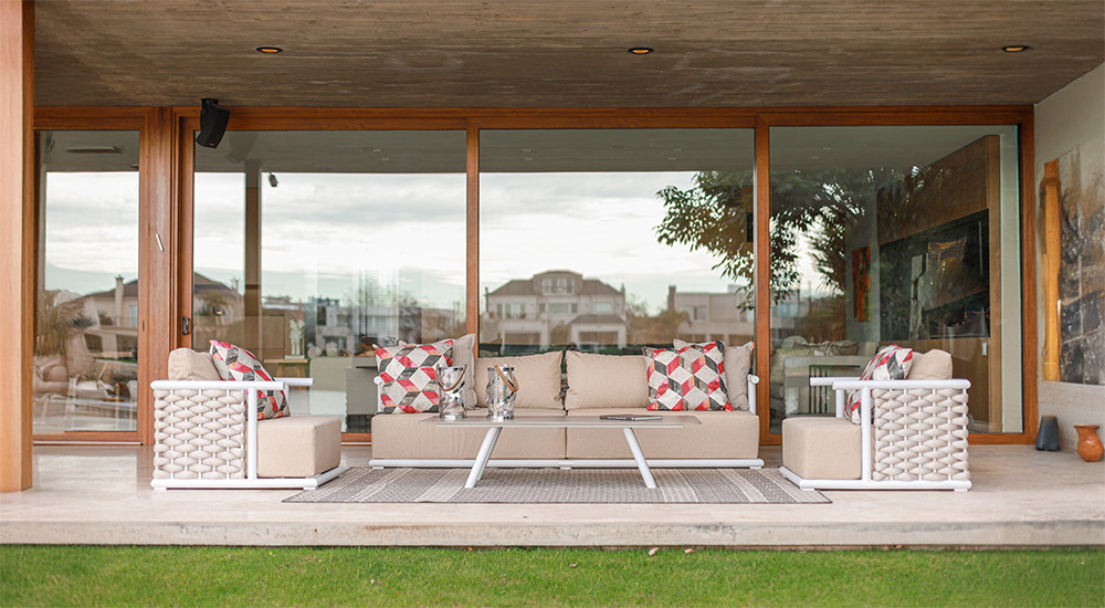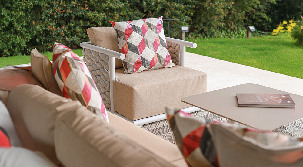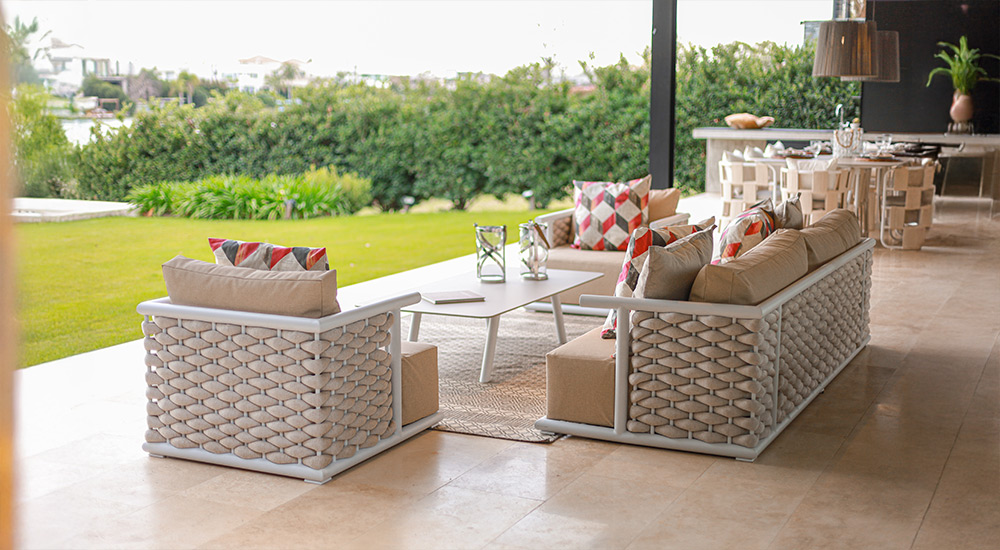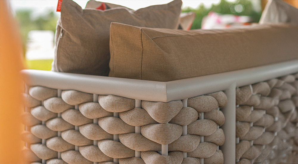 Apto para exterior total. Estructura de aluminio anodizado, tejido en soga náutica y tapicería Outdoor resistente a rayos UV y antimicótica.
