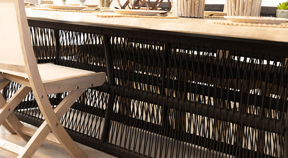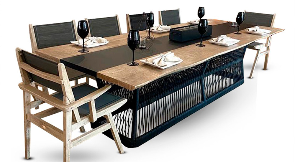 Para espacios semi cubiertos. Con base de aluminio anodizado tejido en tiento náutico de alta resistencia, acompañado de una tapa de madera maciza con terminación envejecida y una faja central de placa italiana importada, resistente a la temperatura y a los rayones.