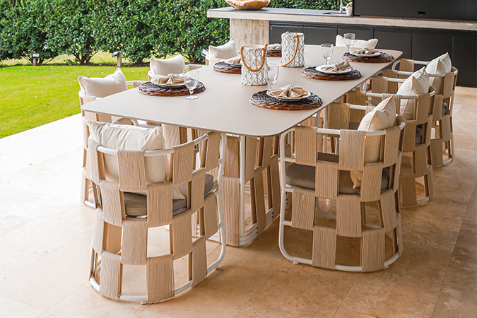 Presenta una sólida base de aluminio anodizado pintado a horno, con tejido en tiento náutico, combinada con una tapa de placa italiana importada especialmente diseñada para resistir las condiciones del exterior en su totalidad.