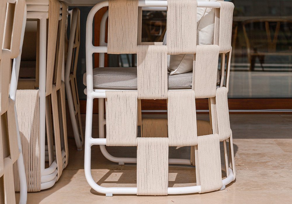 Ideal para espacios al exterior total. Estructura de aluminio anodizado pintado a horno tejida con hilo náutico de alta resistencia, incluye almohadón de asiento confeccionado con tela Outdoor aptas para exterior con filtro UV, impermeable y protección antimicótico.