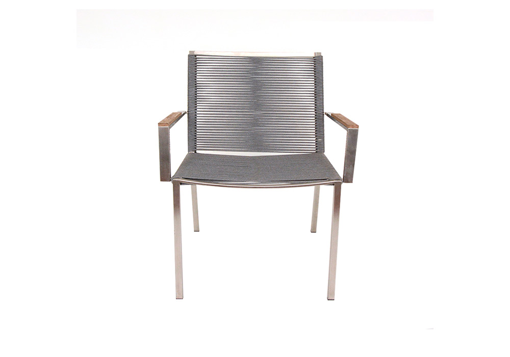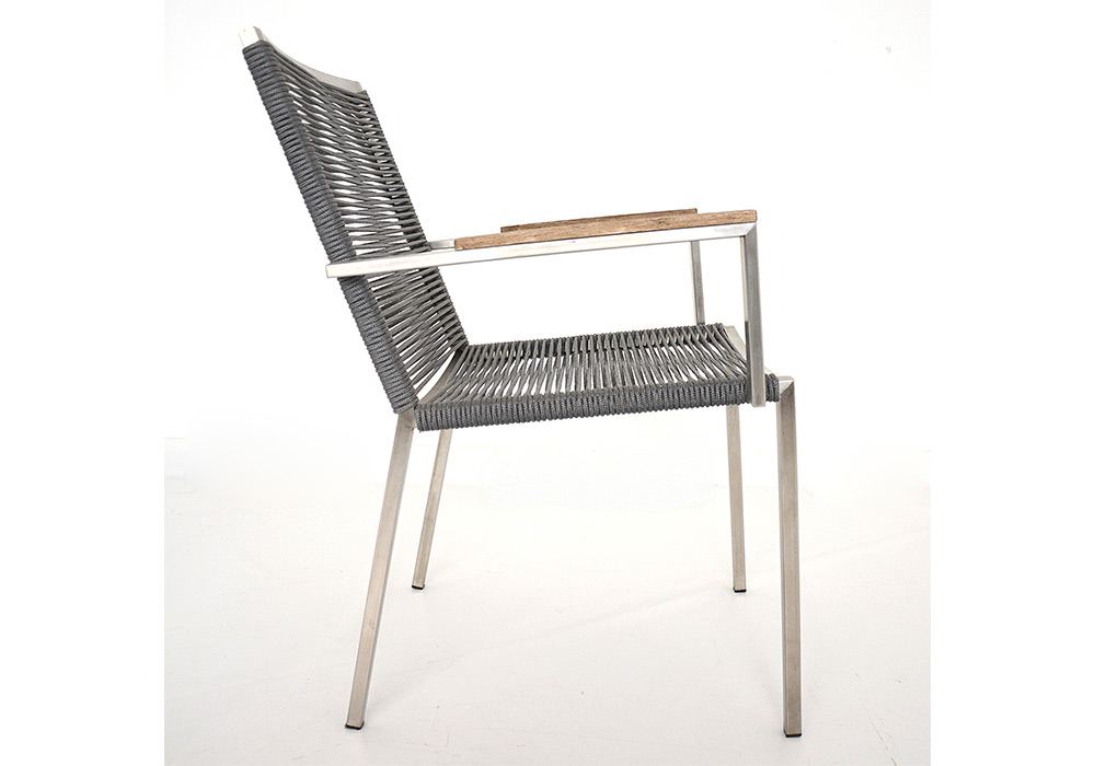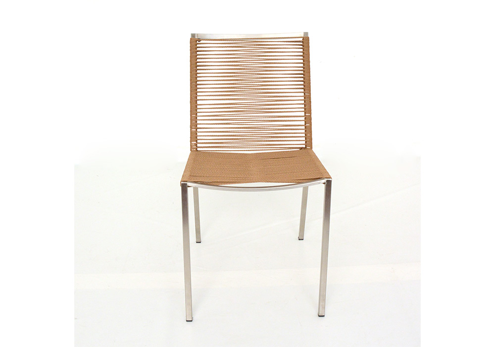 Apta para la intemperie absoluta. Confeccionada en acero inoxidable, con detalles de placa italiana en sus apoya brazos, asiento y respaldo tejidos en tiento náutico ó soga rellena importada.