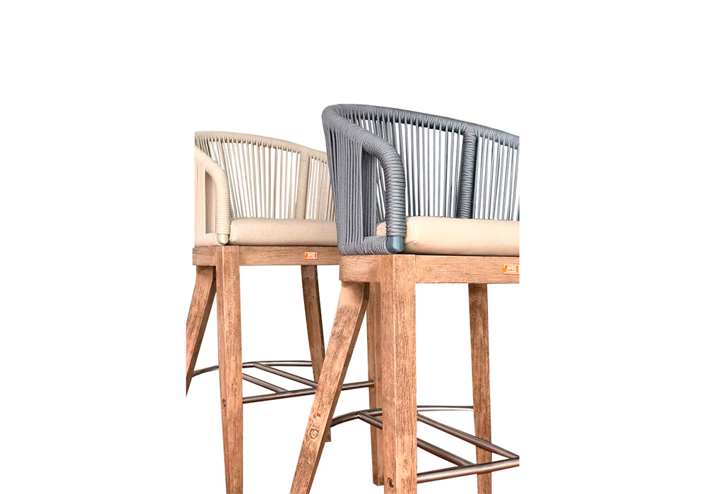 Ideal para galerías o superficies semicubiertas. Confeccionada con una base de madera maciza terminación envejecida, respaldo de aluminio anodizado tejido con hilo náutico y almohadón de asiento.
