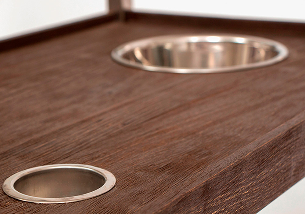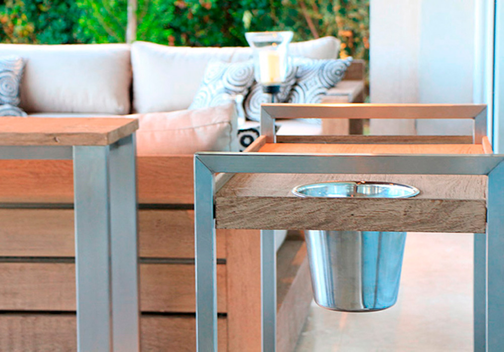 Fabricado en acero inoxidable y madera maciza con terminación envejecida. Cuenta con espacio para organizar las bebidas y en el sector superior cuenta con una frapera embutida de acero inoxidable para mantenerlas frías.