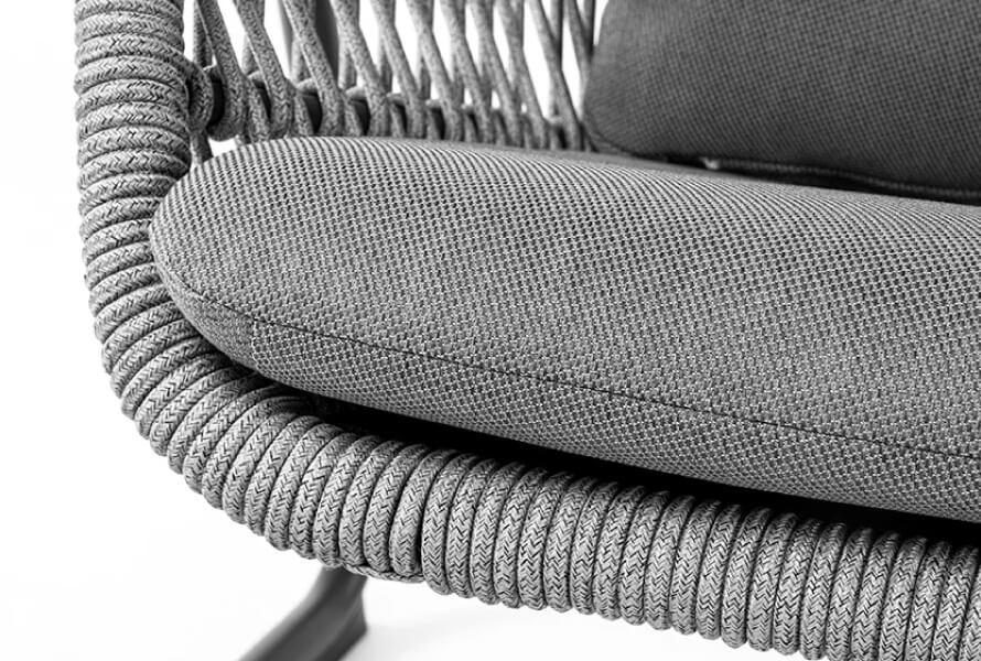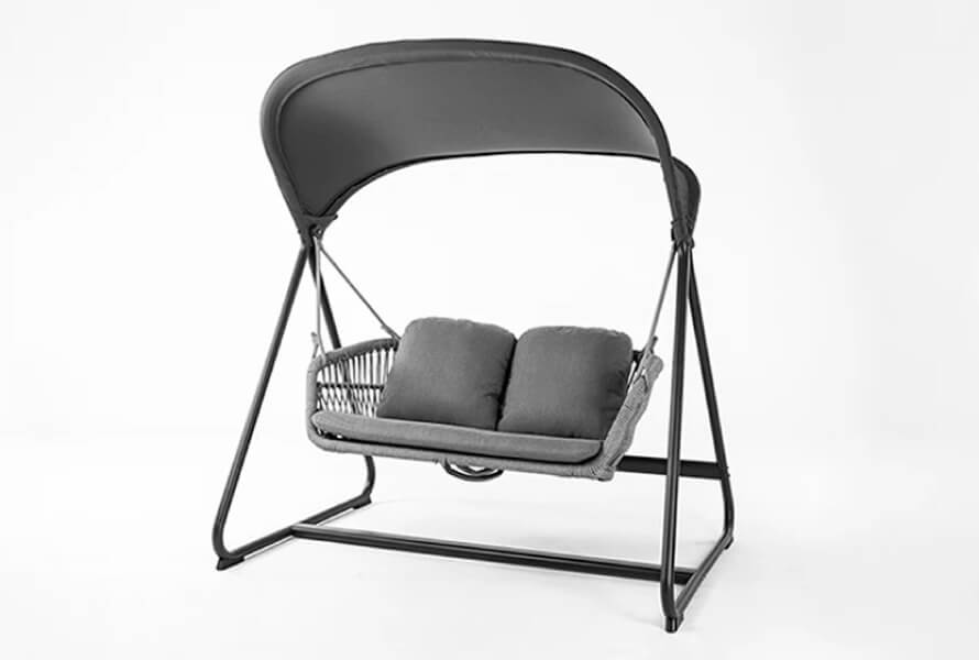 Es ideal para jardín, galería o terraza. Estructura de aluminio reforzada con terminación pintada a horno, asiento doble con tejido en hilo náutico importado de alta resistencia, acompañado de tapicería confeccionada en telas Outdoor, con protección anti micótico y a los rayos solares. Incluye capota para brindar protección solar y sombra durante el día.
