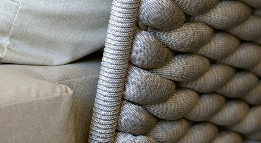 Fabricado con base de acero inoxidable, faja en madera maciza con terminación envejecida, respaldo en aluminio anodizado, tejido con hilo náutico de alta resistencia y soga náutica rellena importada. Su tapicería es género outdoor resistente a rayos UV y protección antimicótico.