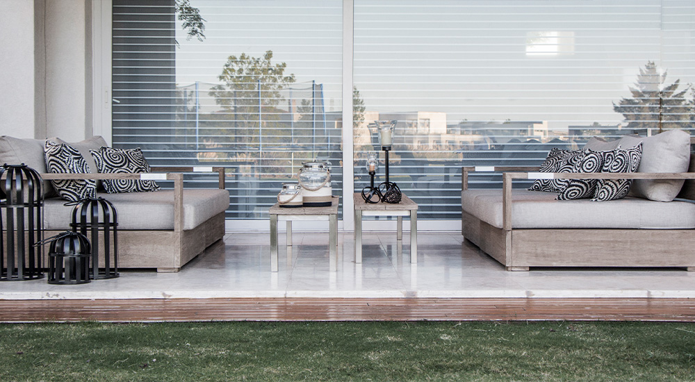 Madera maciza con terminación envejecida y tapicería Outdoor resistente a UV y antimicótico. Mesa con quemador de acero inoxidable opcional.