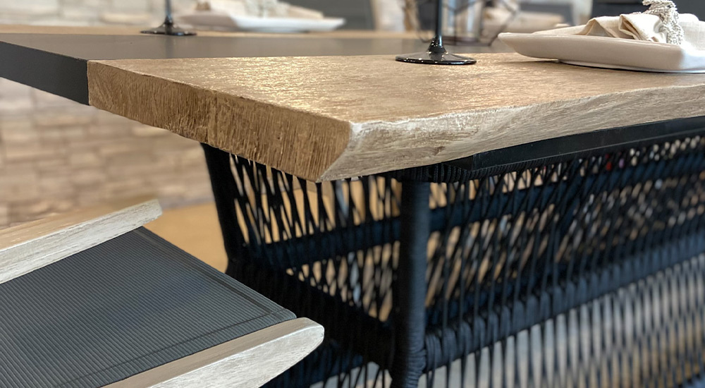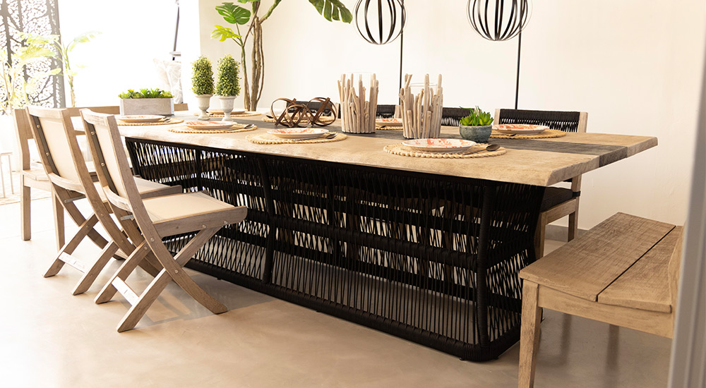 Para espacios semi cubiertos. Con base de aluminio anodizado tejido en tiento náutico de alta resistencia, acompañado de una tapa de madera maciza con terminación envejecida y una faja central de placa italiana importada, resistente a la temperatura y a los rayones.