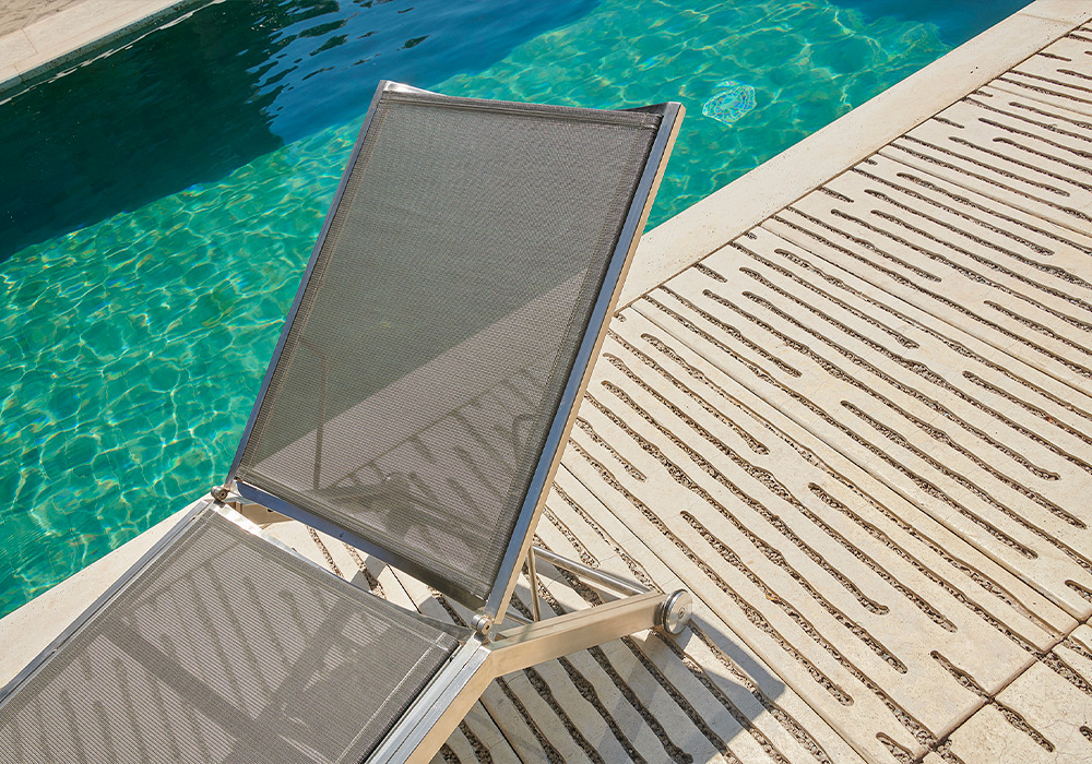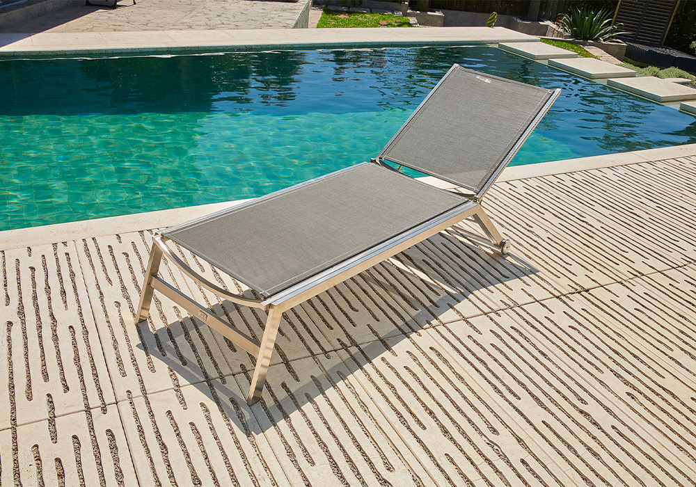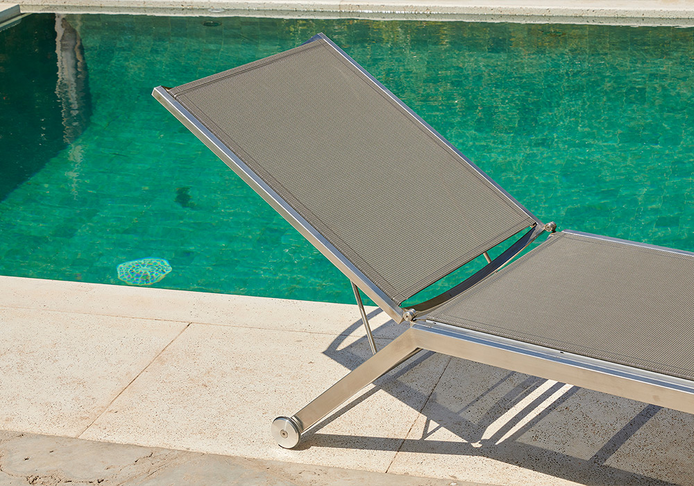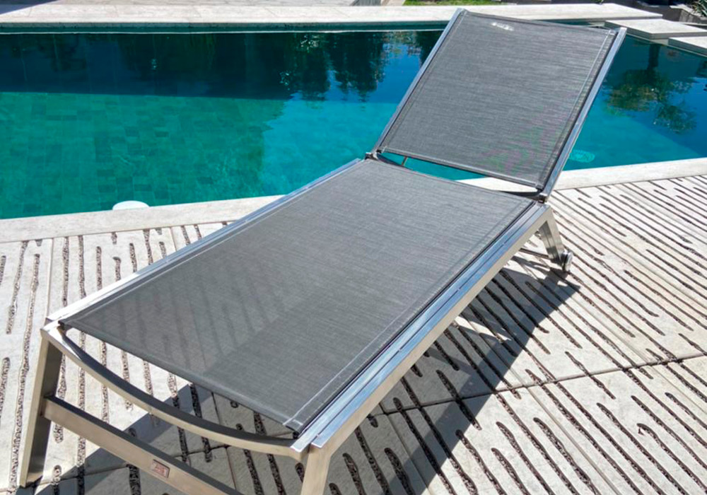 Es 100% exterior ya que está fabricada en acero inoxidable, con asiento y respaldo tapizados con tela textilene Phifertex termosellado.