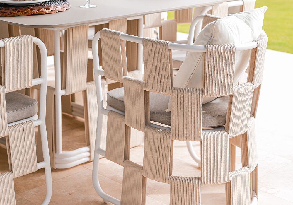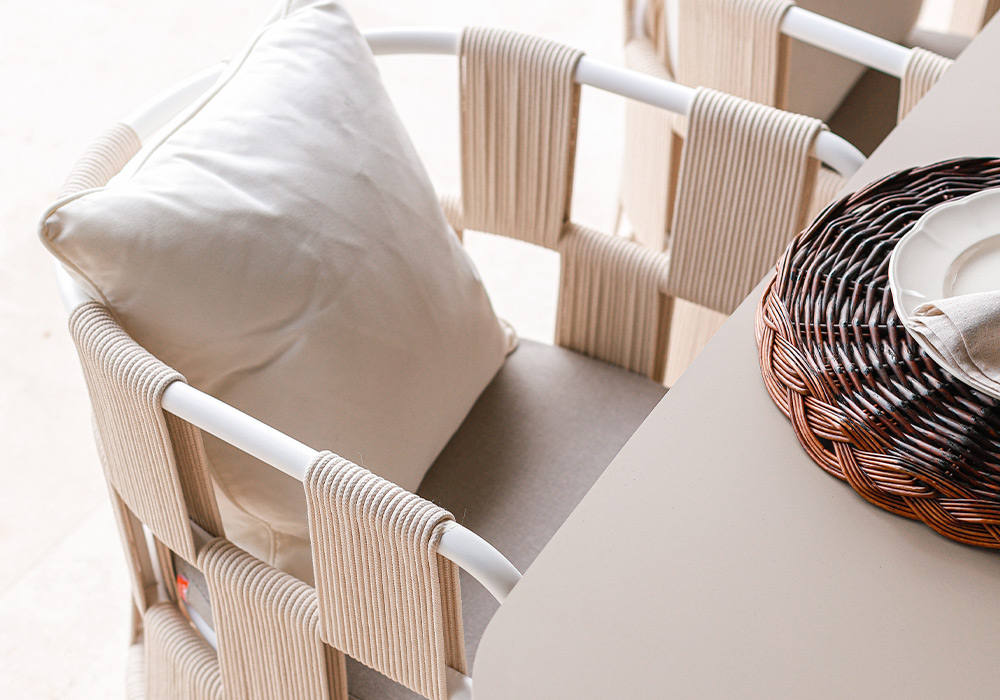 Ideal para espacios al exterior total. Estructura de aluminio anodizado pintado a horno tejida con hilo náutico de alta resistencia, incluye almohadón de asiento confeccionado con tela Outdoor aptas para exterior con filtro UV, impermeable y protección antimicótico.