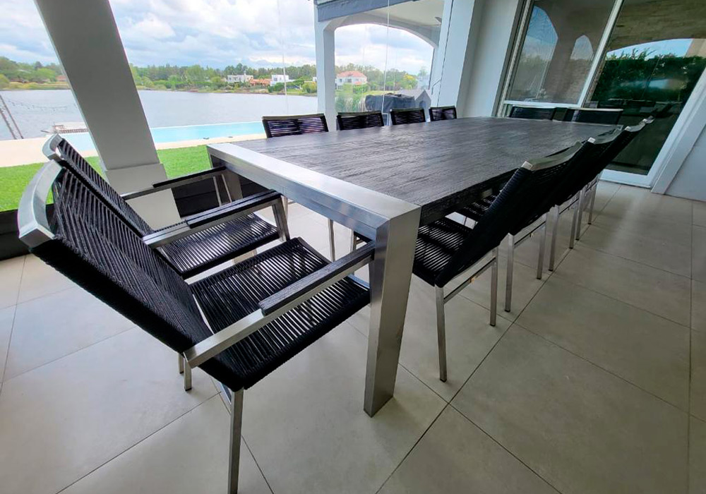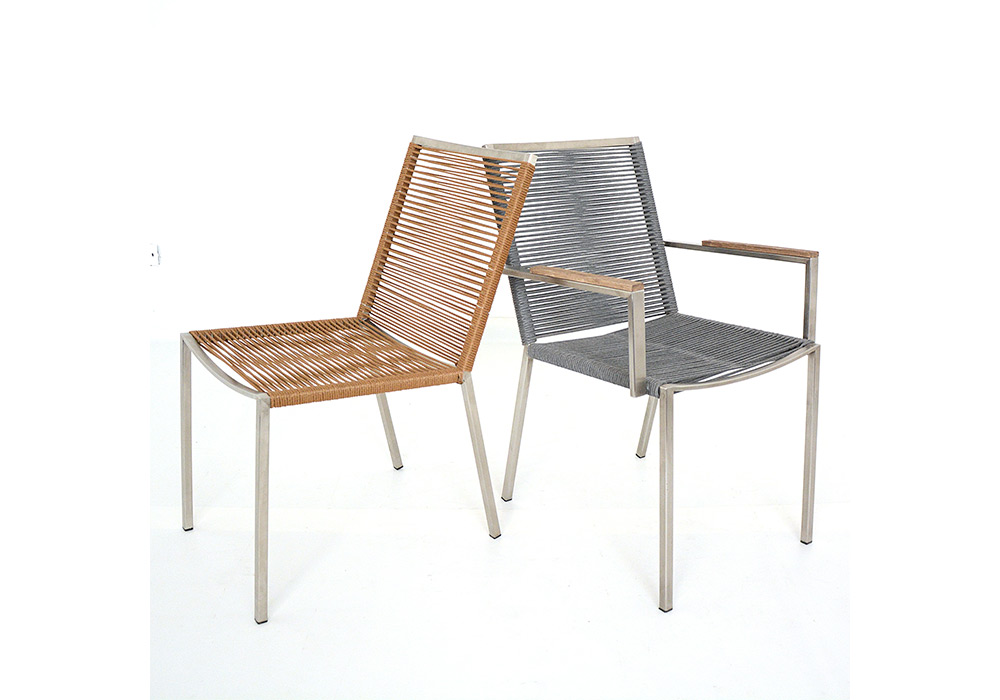 Apta para la intemperie absoluta. Confeccionada en acero inoxidable, con detalles de placa italiana en sus apoya brazos, asiento y respaldo tejidos en tiento náutico ó soga rellena importada.